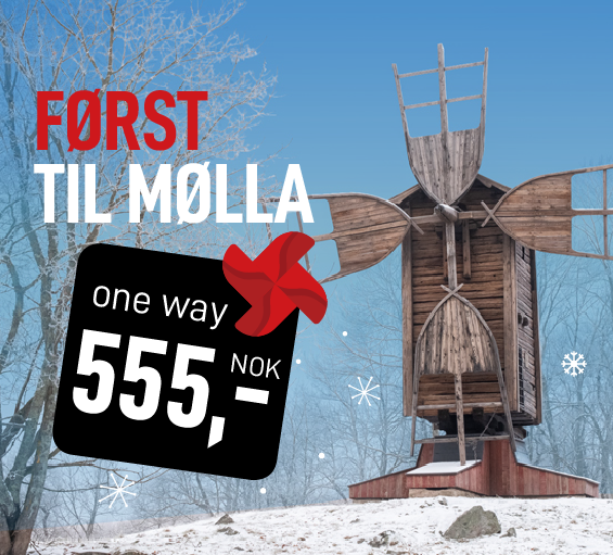 In addition to our usual affordable prices, we offer a large number of “Først til Mølla” tickets on selected routes: On the first Tuesday of every month, we sell one-way tickets for 555 NOK one way for travel the following month.